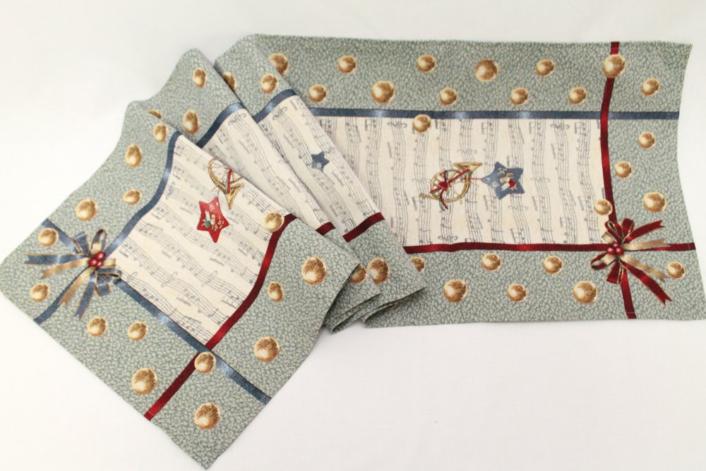 Gobelínový ubrus se zlatými ozdobami na zeleno- modrém podkladu uprostřed se smetanovým podkladem a s notovým motivem.